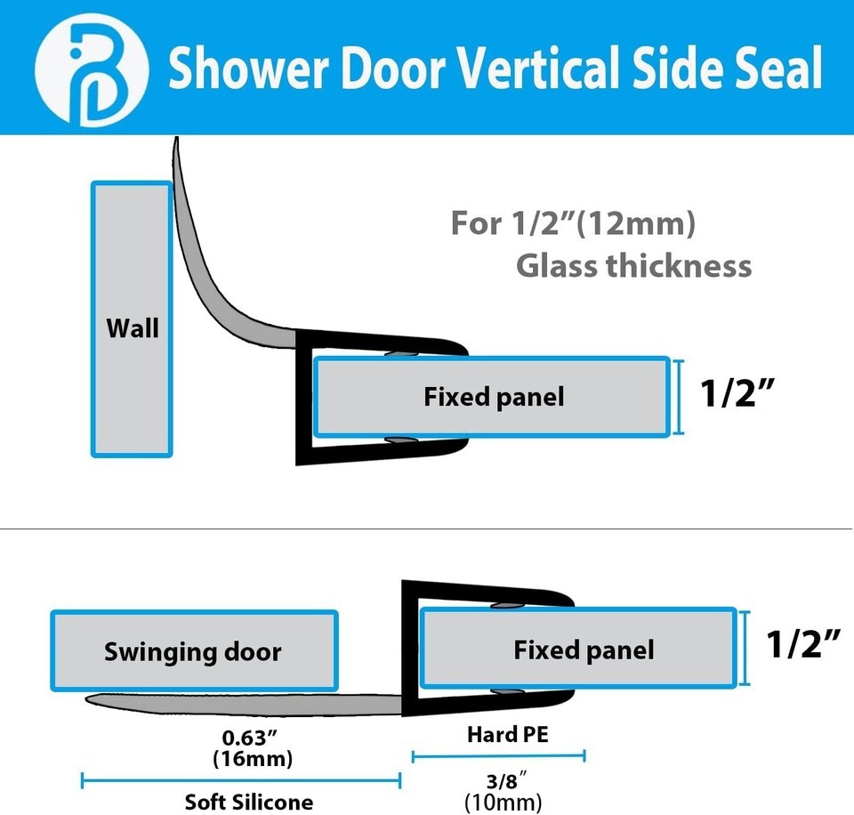2-Pack Frameless Shower Door Side Seal Strip for 1/2" Glass Doors, Vertical P...