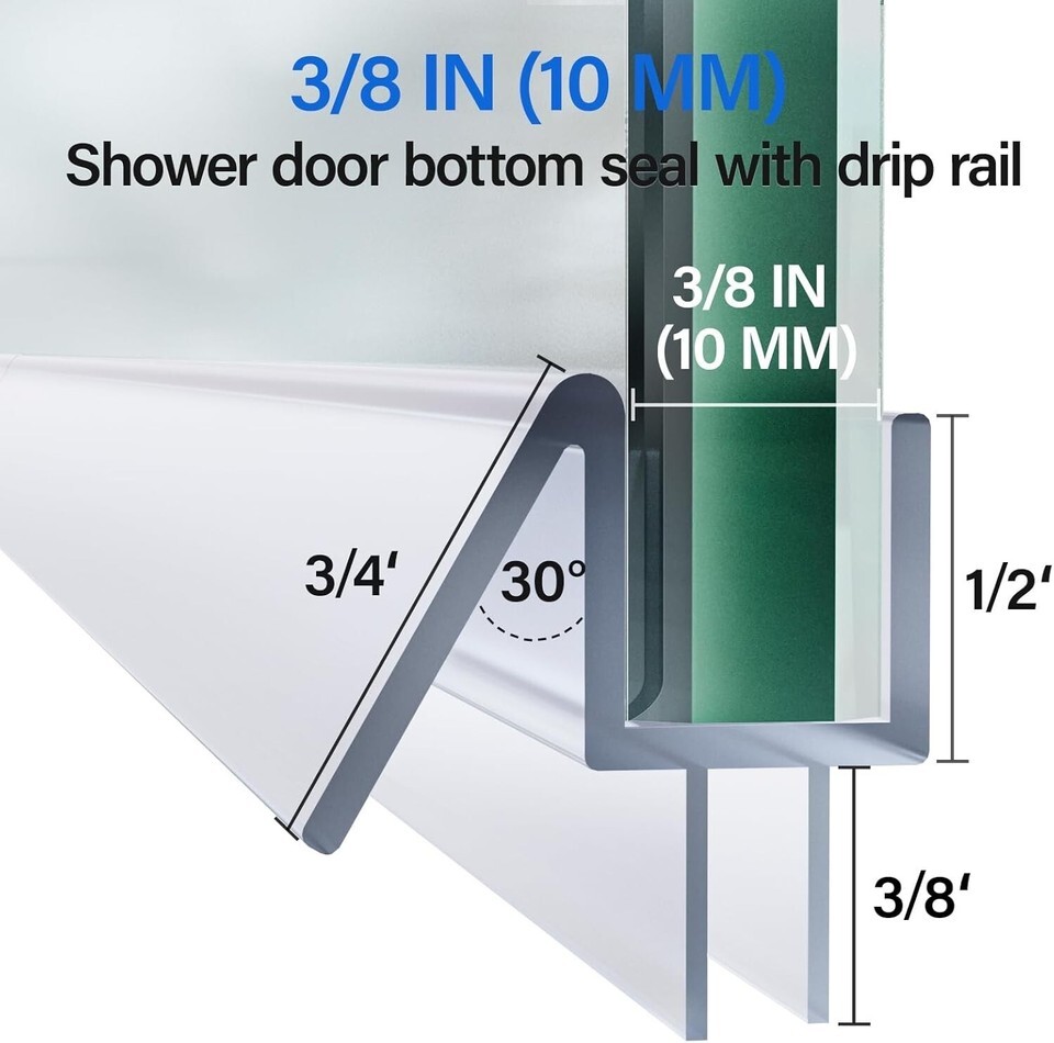 Only For 3/8" Thick Frameless Shower Doors! Our specialized shower door bottom seal is ideally suited for 3/8" (10mm) thick frameless shower doors. Crafted with a highly PVC plastic strip, it firmly adheres to the door, ensuring zero water seepage during opening and closing. We advise you to measure the thickness of your bathroom door before making a purchase, to ensure it is compatible with our shower door seal strip