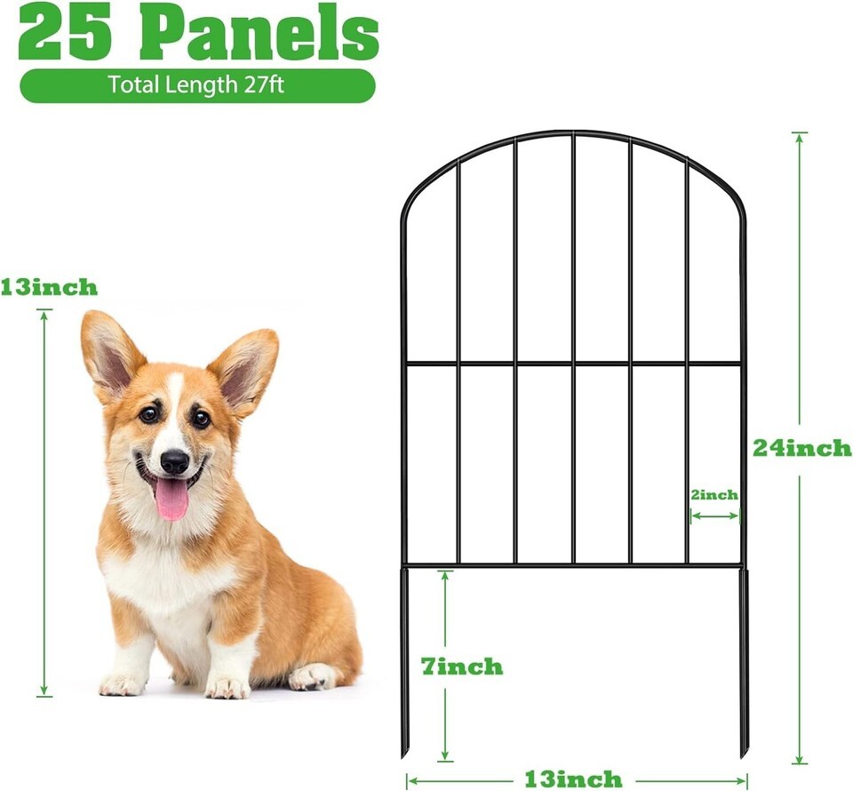Dimension: The height of each piece of the decorative garden fence is 24 inch(7'' stakes in soil) and the width is 13 inch, with a total of 25 panels. It's 27 feet long to connect all of them.