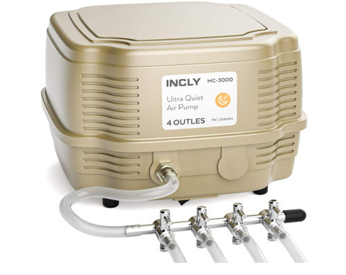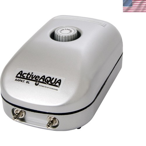 This air pump with 8 Outlets is super silent with multi-level muffler, low power consumption. Special artificial rubber to keep a steady air flow output and pressure that can be adjusted freely. Low power consumption. 1- . 12-watts, 25-liter per minute, 120-voltage. 400-GPH, maximum amperage is and maximum decibels is 45. Measures 7-inch length by 5-1/2-inch width by 11-inch height. This product weighs is 6-pound.