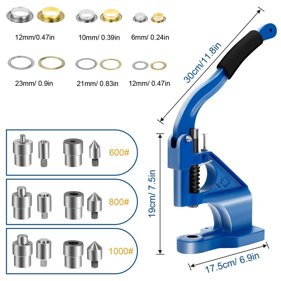 ?Iron Materials?Heavy duty hand press eyelet grommet hole punch machine, 6pcs dies and 3000pcs 3 sizes (6, 10, 12mm) sliver/gold grommets, 500pcs for each size and each color, the punching machine uses quality metal materials. Very thick and hard, good abrasion resistance, no decay or rust, to ensure it is more durable and has a longer service life.