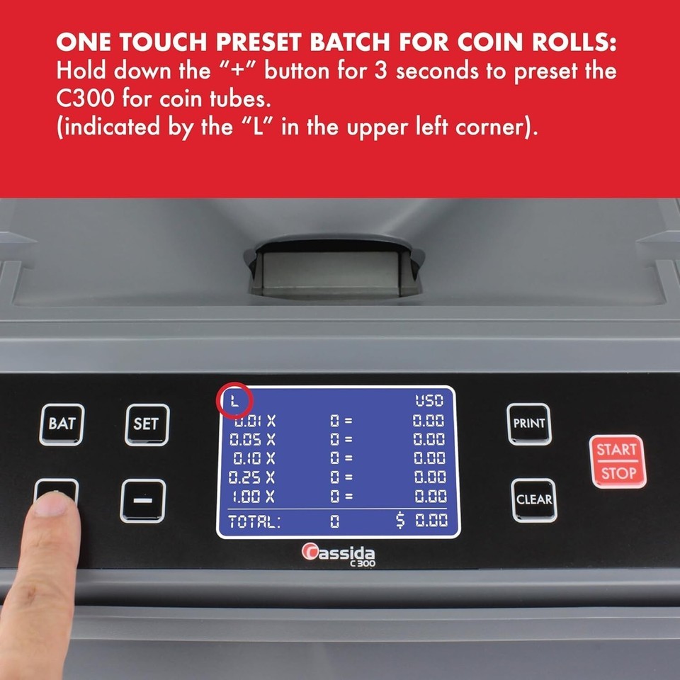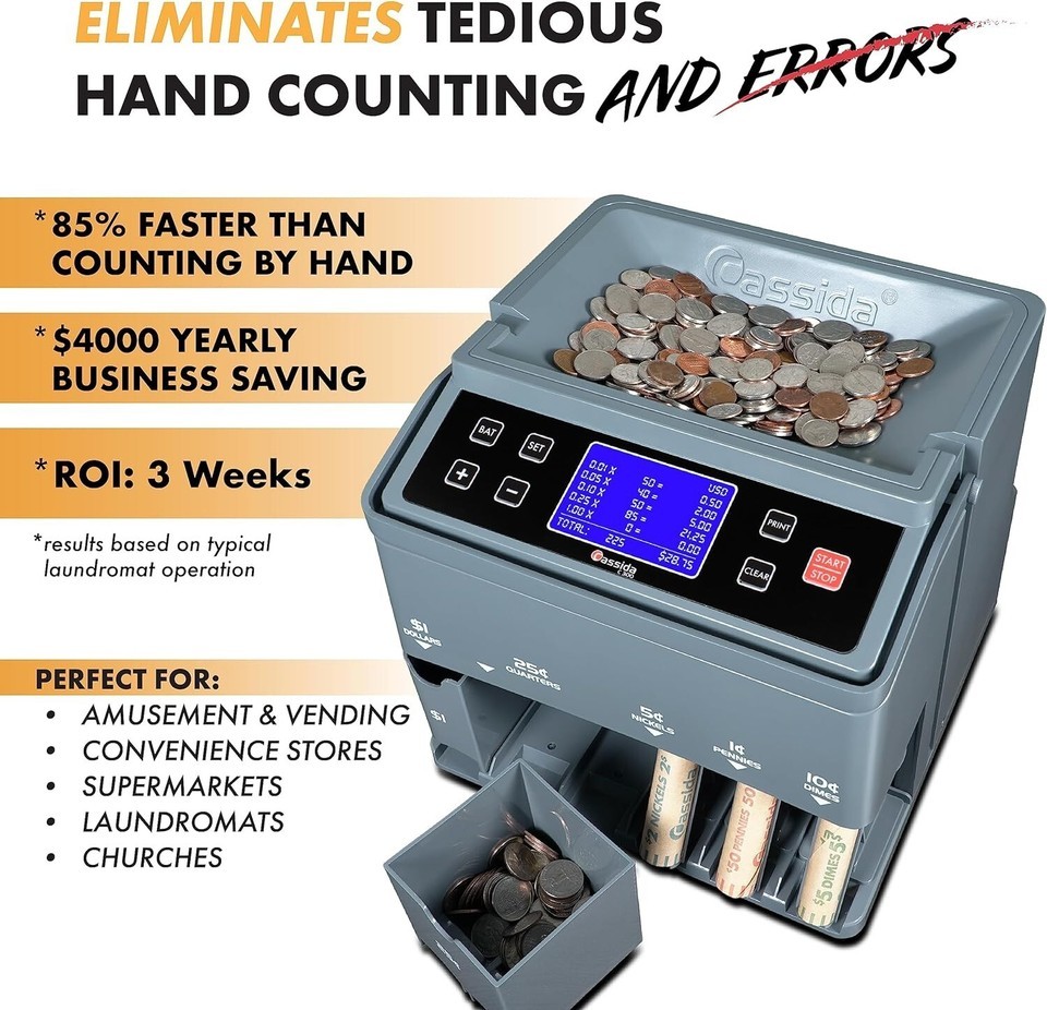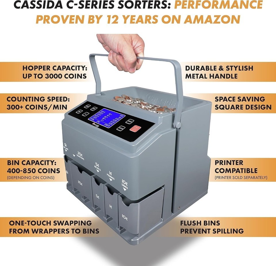 A Complete Solution to Coin Counting, Sorting and Wrapping The is the leading commercial-grade coin counter, sorter and wrapper in the market over 25 s of experience, 's is the next generation in series of coin counting solutions designed to make the process of coin counting easier and much most machine features new to the market 'Quick Load? coin tube technology, printing connectivity, magnetic bins and a ?One-Touch? batch setting mode for automatic fill of tubes and in operation and compact in size, the makes for a perfect addition to any desk to recognize individual denominations and sort them automatically into bins or tubes (for wrapping/rolling) depending on your needs, the takes the following Coins: Dollar Coins, Quarters, Nickels, Dimes and load the 2,000 coin capacity hopper, press start, and walk away. With the ?One Touch? batch setting, the will automatically fill the bins or the preformed coin wrappers and stop when the bins or tubes are full. Custom batch setting available so you can easily customize coin batches to your own needs, such as making coin rolls for some denominations while other coins fill up the bins.Knowing how much of each coin being sorted and counted by looking at the large LCD display, puts your mind at ease as you watch the machine tally up your coins while breaking them down by the the end of your count, simply pair the with the Thermal Printer (sold separately) to print a detailed receipt of your daily count for easy bank deposits and personal record keeping.