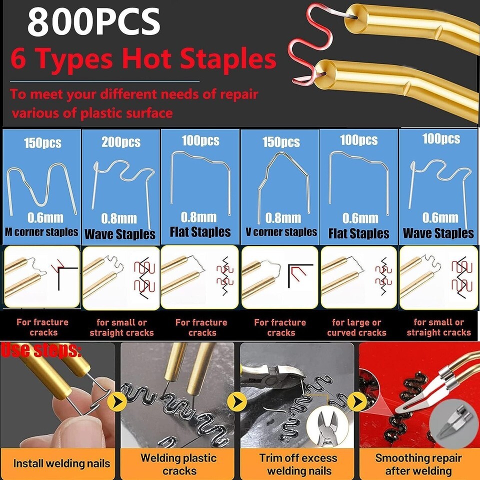 Comes with 800pcs hot staples and 100pcs plastic rods for versatile repair options