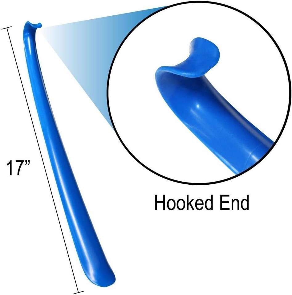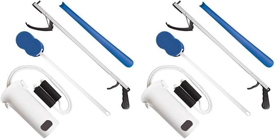Includes a Plastic Sock Aid with Foam Handles, 26" Reacher, 17" Plastic Shoehorn, and a Blue 18" Handled Sponge
