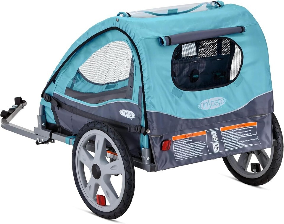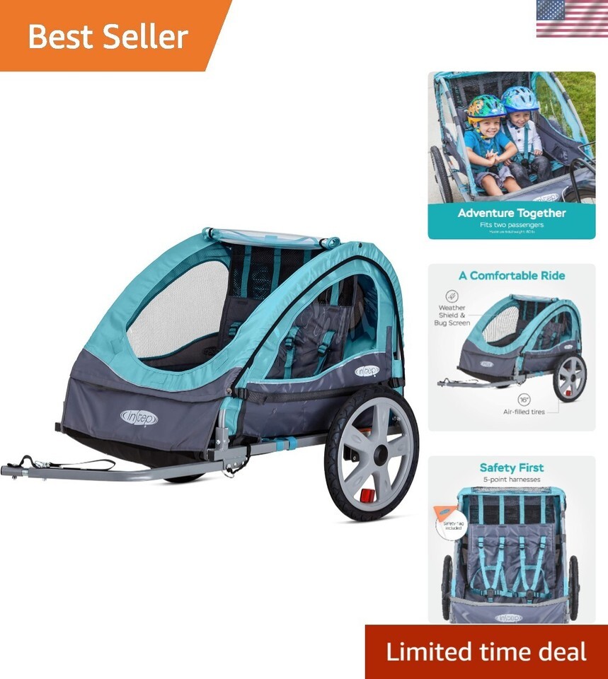 There's no end to the versatile experiences awaiting you with an trailer. Whatever you can think of is possible with . Your next adventure is just a ride away. 16-inch pneumatic tires with molded rims provide performance, safety, and timeless style. A five-point harness and safety flag ensure your riders are protected. Designed to protect your child from the elements, a 2-in-1 canopy features both a bug screen and a weather shield with rear vent window. This tow-behind child carrier fits most bike styles, thanks to a versatile bike coupler. Some assembly is required. The folding-frame design and quick-release wheel make for quick and easy assembly, storage, and transport.