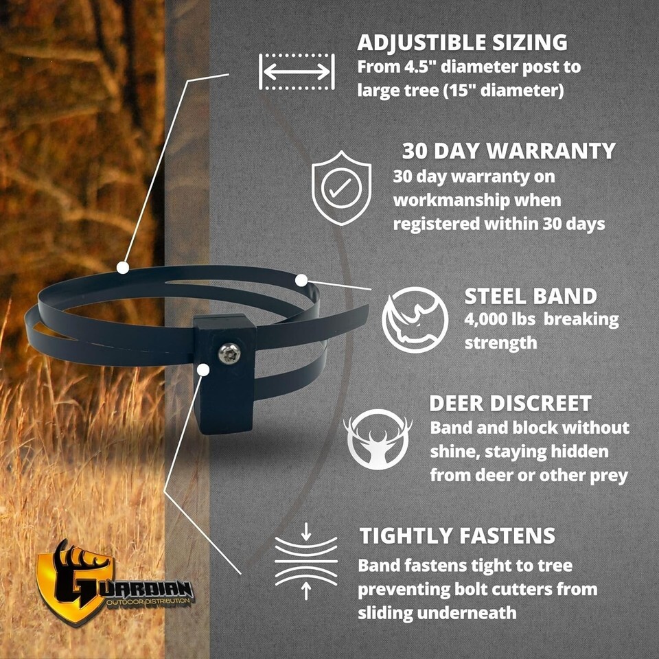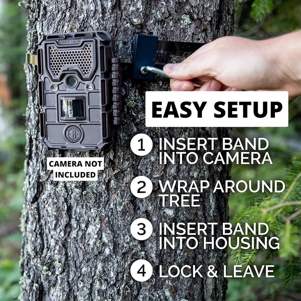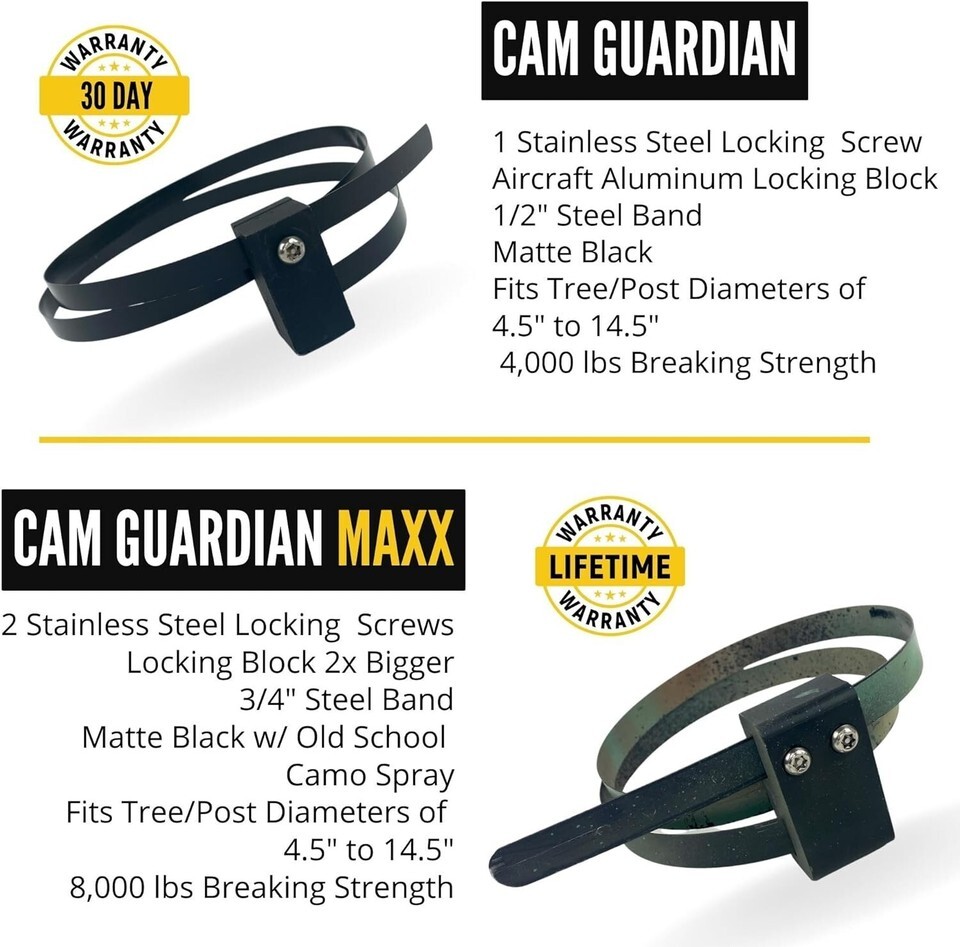NO MORE STOLEN TRAIL CAMERAS - This Trail Camera Mount is the SOLUTION to your problem - Secure them with a Cam Guardian. This Guardian provides 48 inches of steel band to secure your cameras to a tree up to 15 inch diameter.