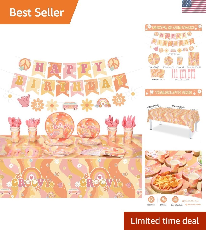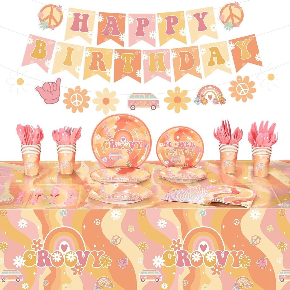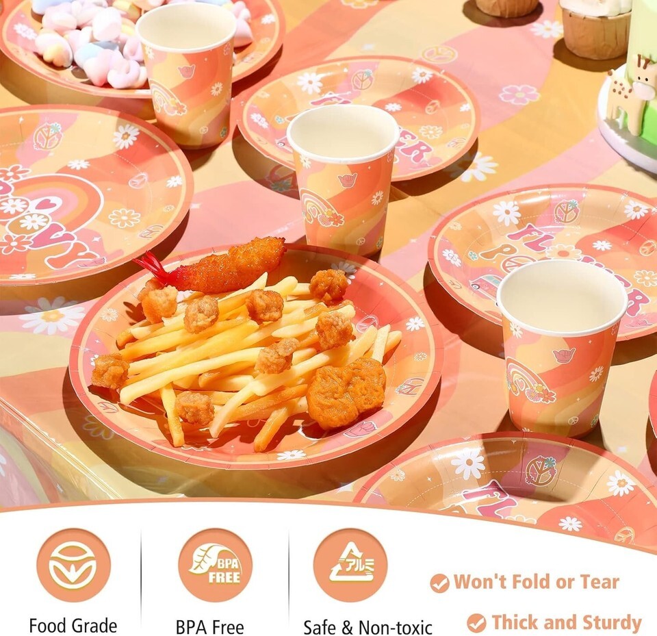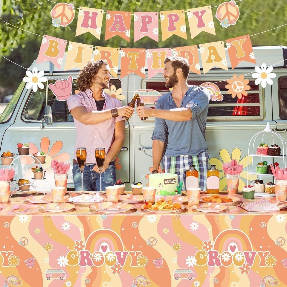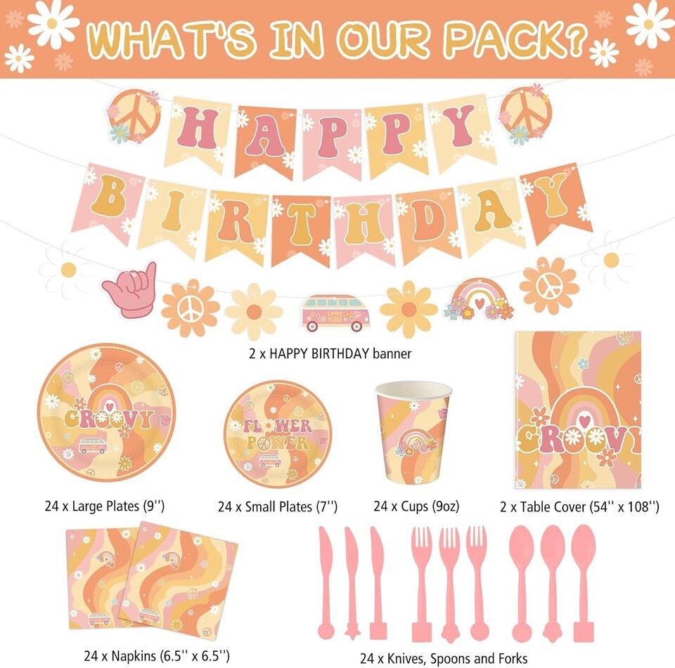 Serves 24 Guests: this set of retro hippie boho party supplies comes with 24 daisy dinner plates in 9 inches, 24 groovy party plates in 7 inches, 24 groovy napkins, 24 knives, 24 forks, 24 spoons, 24 pcs 9 oz cups, 2 hippie tablecloths, 3 groovy birthday party banners, these theme tableware kit allow you to serve 24 guests well on a groovy retro party