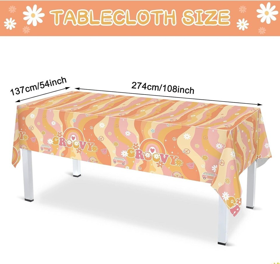 Quality Groovy Tablecloths: you'll get 2 pieces of daisy party tablecloth made of thick plastic, each table cloth measures approx. 54 x 108 inches, large enough to fit most tables, a nice way to keep from stains, spills and drinks