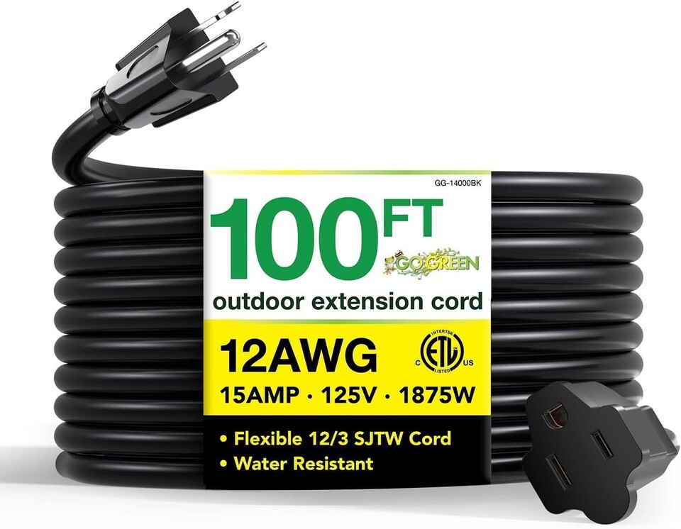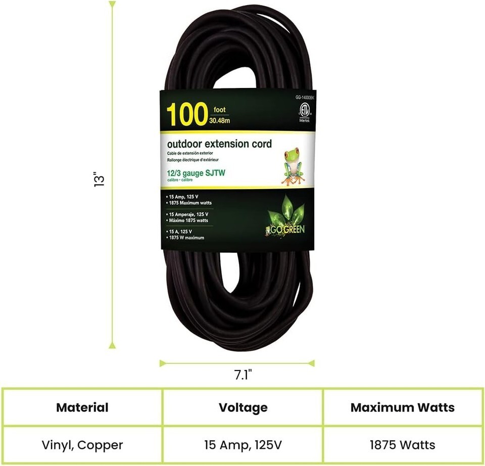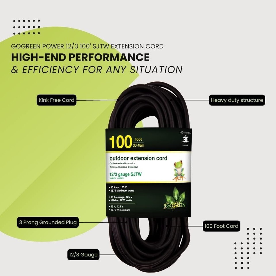 Go Green Power Inc. GG-14000BK 12/3 SJTW Outdoor Extension Cord, Black, 100 ft