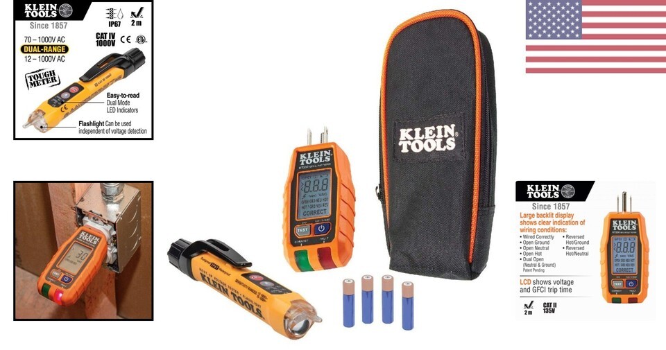 Ensure the safety and functionality of your electrical outlets with our premium Electrical Test Kit. With features like clear LCD readout, trip time display, and open neutral and open ground detection, this kit is designed to make electrical testing easy and accurate. The dual-range non-contact voltage tester and integrated flashlight add versatility and convenience to your electrical work. Don't settle for subpar testing tools - choose our Dual-Range Voltage Tester Set for reliable and efficient electrical testing.