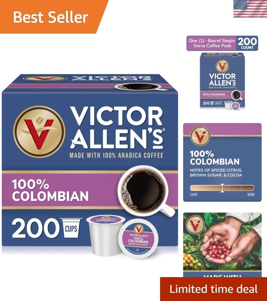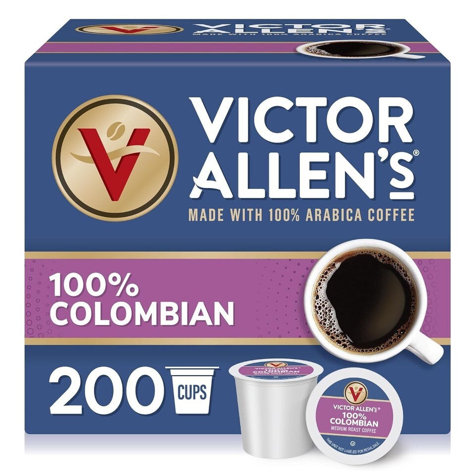 Contains 1 box of 200 pods of Victor Allen's 100% Colombian Single Serve Coffee Pods (200 pods total)