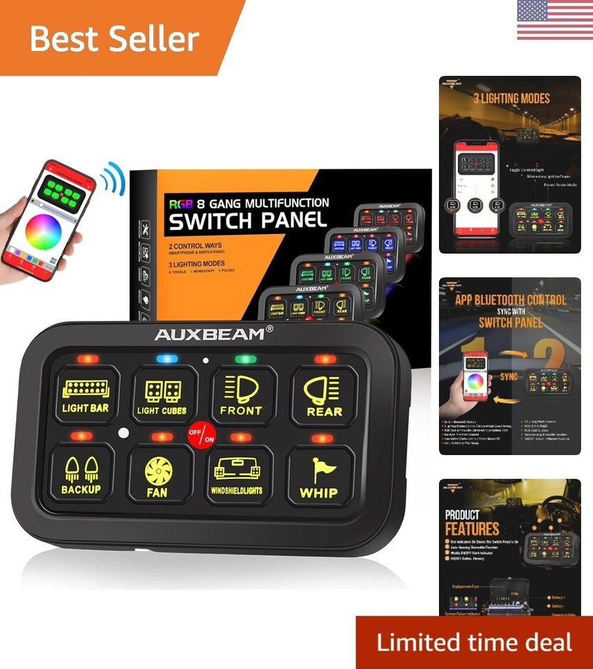 8 Gang Switch Panel RGB AR-800 Toggle Momentary Pulsed Bluetooth Switch Panel for Truck SUV UTV ATV Marine RV Camper Van, Multifunction 12-24V Waterproof 2 s