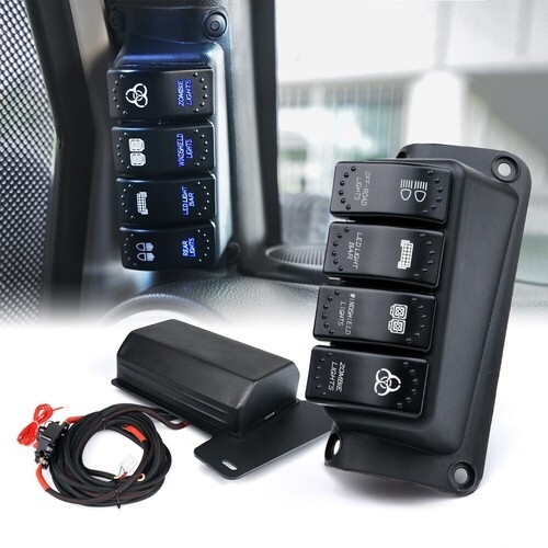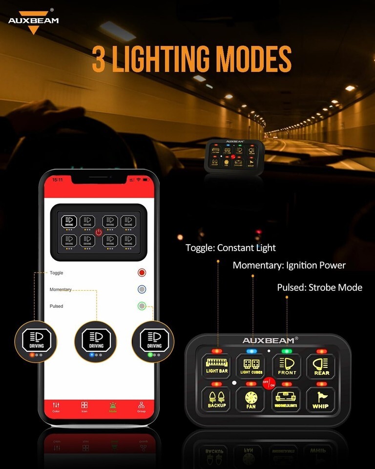 AUXILIARY SWITCH PANEL. Vehicle interior light switch has un color options matching your dash light, the latest LED switch panel can be operated via switch panel pad or smart Bluetooth, work synchronously. Vehicle accessories switch, manual light brightness adjustment auto-sensing dimmable function.