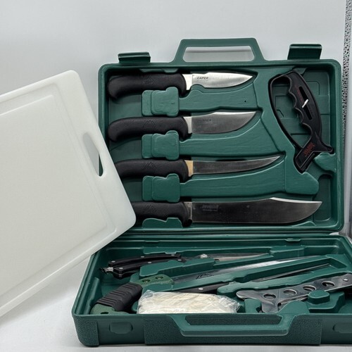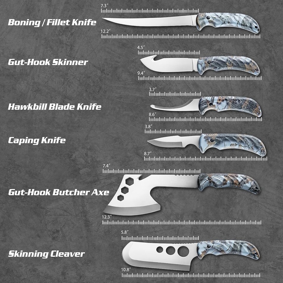 Game Knife Set Includes: 12" Boning Knife; 9-1/2" Gut-Hook Skinner; 8-1/2" Hawkbill blade knife; 8-1/2" Caping Knife; 12" Gut-Hook Butcher Axe; 10-1/2" Skinning Cleaver; 8-1/2" Bone Saw; Ribcage Spreader (6-7/8" to 12"); 9-1/4" Game Shear; 11-7/8" * 7-7/8" Cutting Board; Knife and Shear Sharpener; Cleaning Gloves.