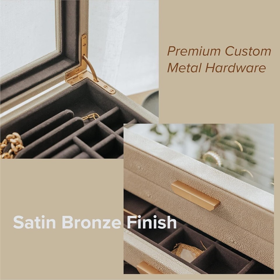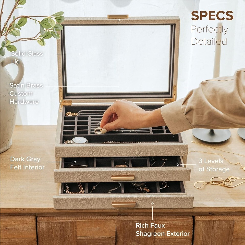 Large 3 Tier Jewelry Box, Storage Case Organizer for Women Girls Wife, Glass Lid for Earrings Bracelets Rings Necklaces, Shagreen Vegan Leather, Velvet Lined Jewelry Box, Brass Hardware