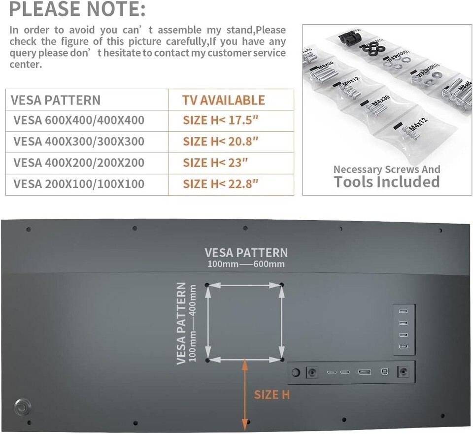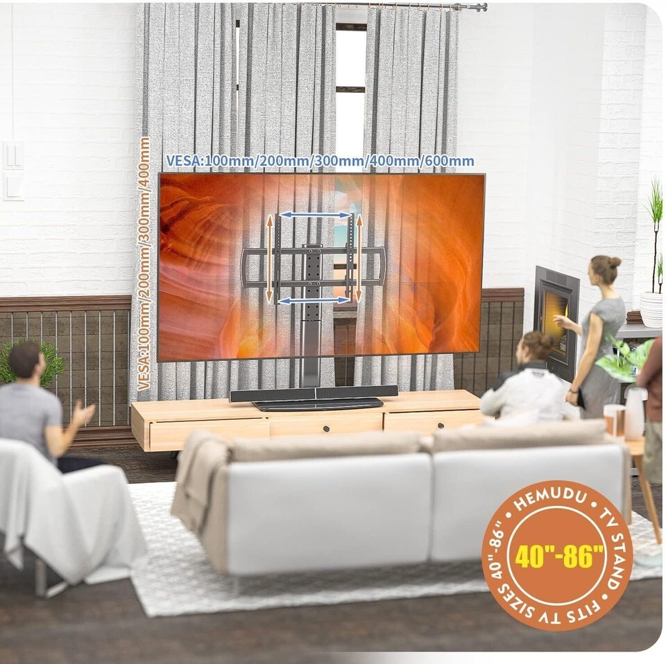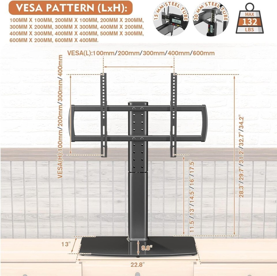 UNIVERSAL SWIVEL TV STAND WITHOUT DRILLING HOLE ON WALL ? Designed with a heavy duty steel pole and 10mm thickness tempered glass base, this free standing TV stand can easily hold your TV on your table with safety and stability, you don't need drill holes on your wall,besides this table top TV stand fits 40 to 86 inch TVs with VESA pattern from 100mmx100mm to 600mmx400mm, holds up to 132lbs screens
