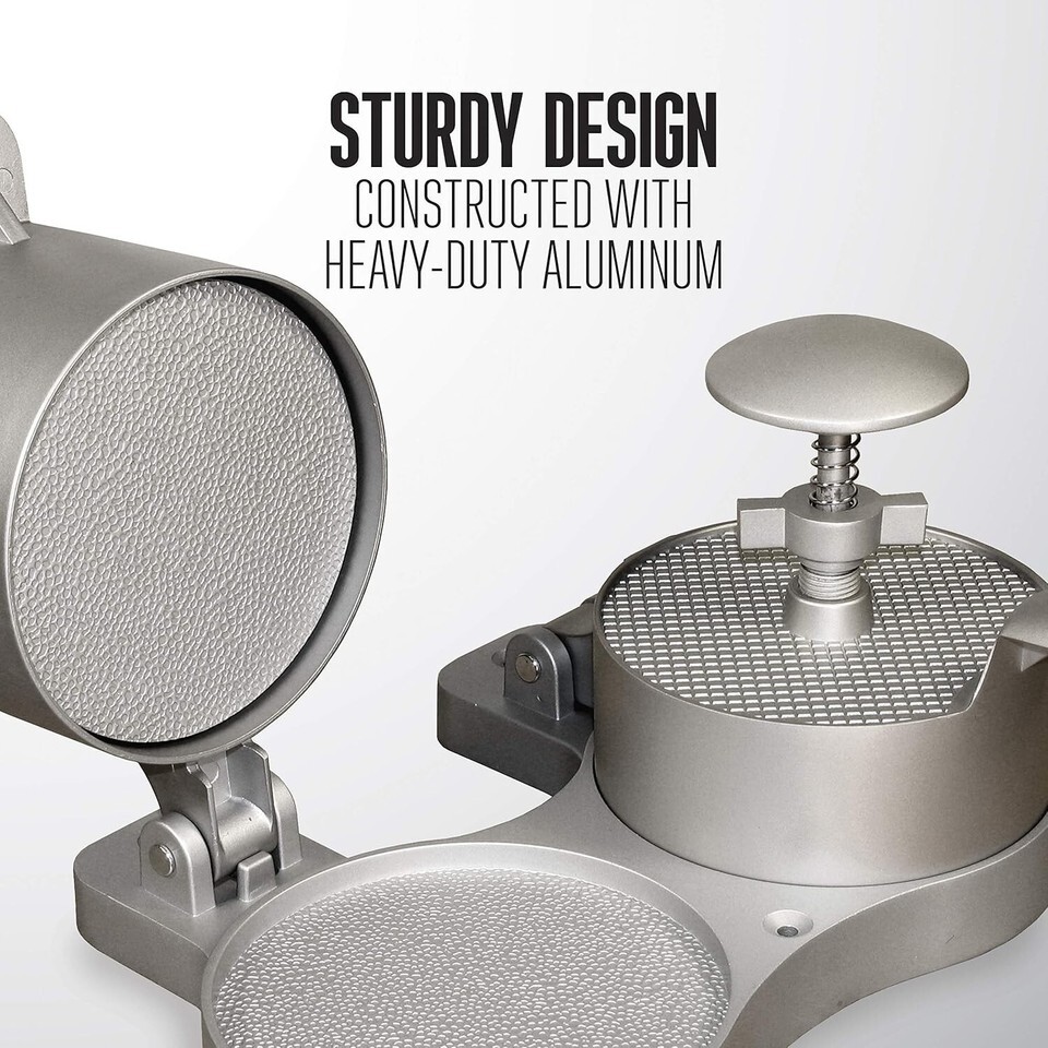 STURDY DESIGN: Double burger press is constructed with heavy-duty aluminum.