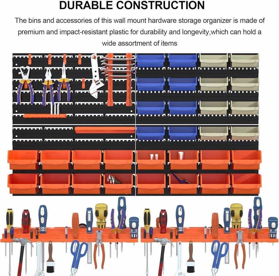 ?Durable Construction?The bins and accessories of this wall mount hardware storage organizer is made of premium and impact-resistant plastic for durability and longevity,which can hold a wide assortment of high quality ABS back peg panels are equipped with upgraded mounting slot design for extra stability,make the removable bins snap on the rails easily!You can conveniently mount this garage tool organizer on your wall for easy access and saves you from the mess on your floor otherwise