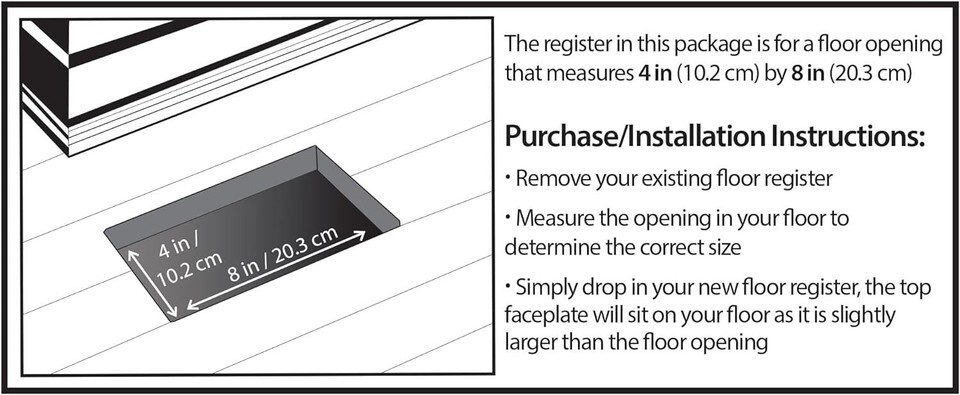 Fits in a 4" x 8" floor duct opening; dimensions are for the opening in the floor - the damper will fit inside, the top portion will be slightly larger to sit on top of the floor