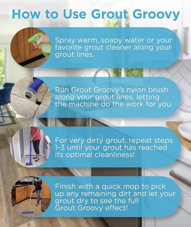 Cleaning Tips | Our grout master cleaner must be used with a liquid cleaning agent to loosen the dirt and lubricate the brush. Allow to dry for 24 hours, as wet grout looks dirty. For severe areas, multiple applications will be needed. This grout cleaner machine for tile floors removes dirt from grout. Grout Groovy does not remove stains, oil, grease, or clean grout that has been neglected for many s. Grout Groovy is for indoor use only.