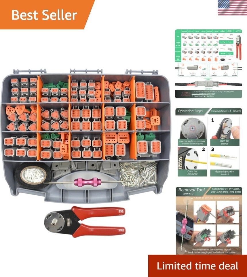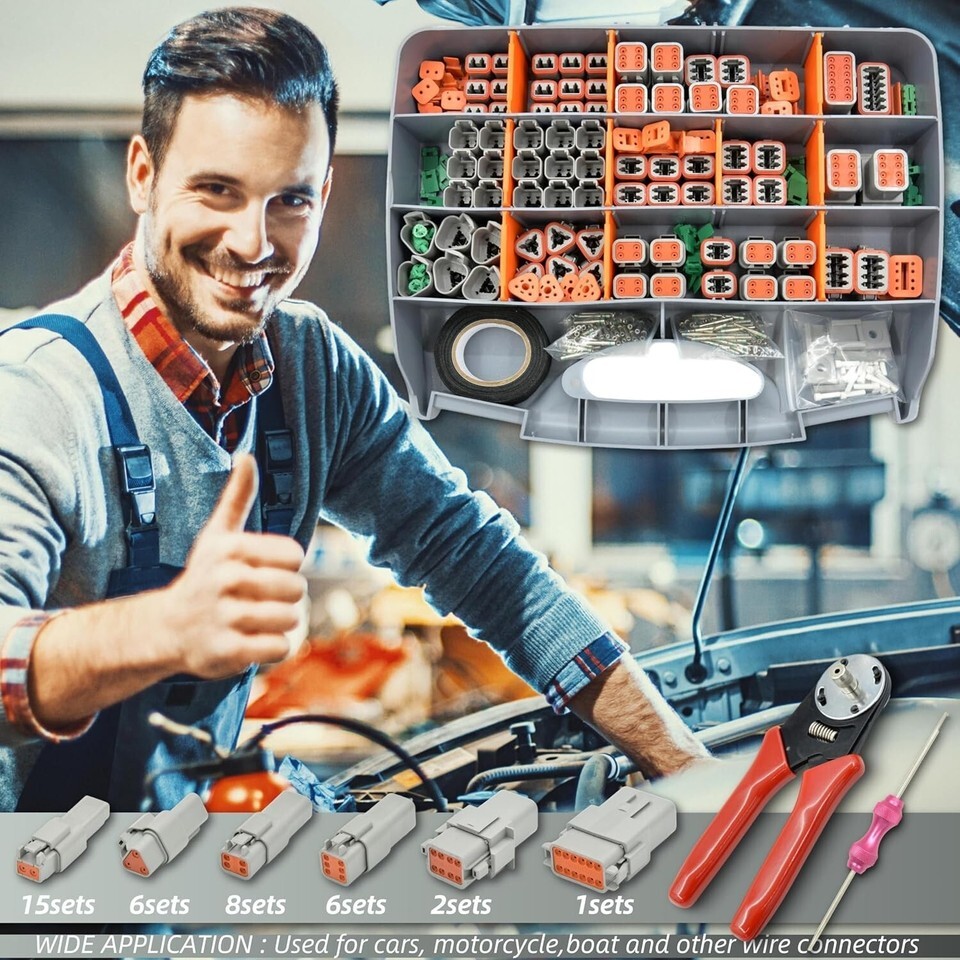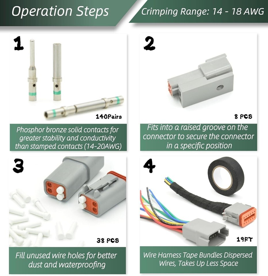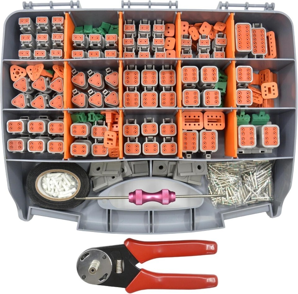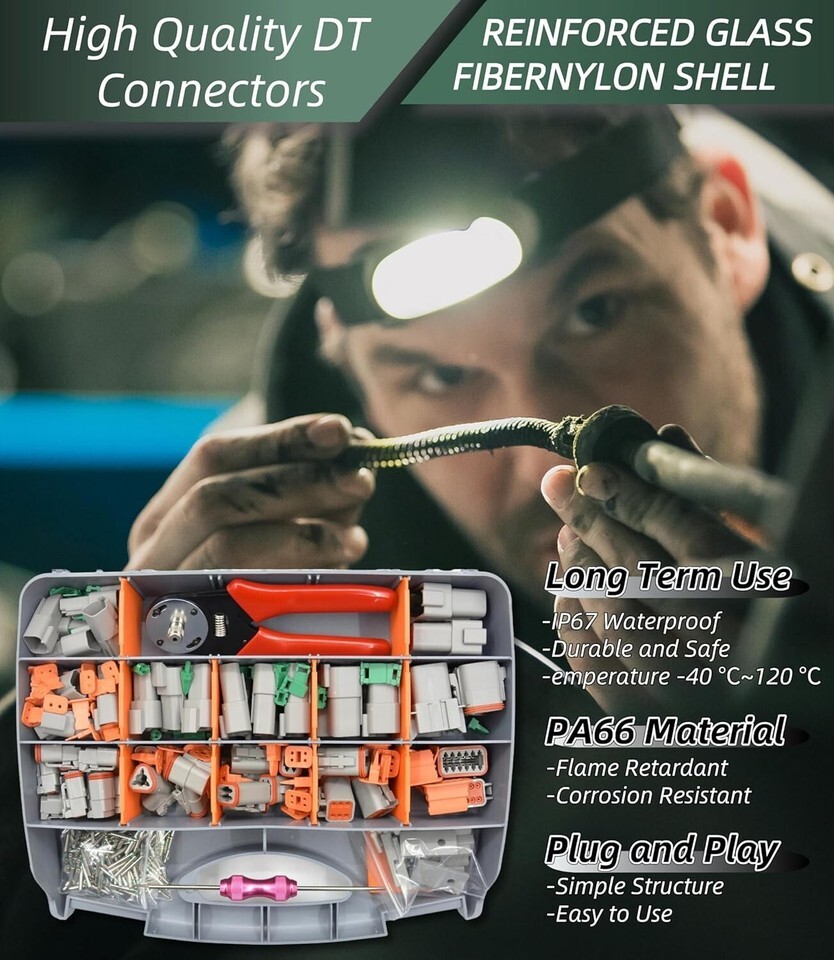 Deutsch Connector Kit: Includes all components to assemble DT electrical connector plugs as well as disassembly and crimping tools. All DT connectors are made of flame-retardant nylon (PA66+30% GF), water and dust resistant, strong quality and safe installation. The stronger snap-on design ensures that the contacts are inserted accurately and completely into the housing, preventing them from slipping out of the connector. It can also be easily removed for plug-and-play when needed