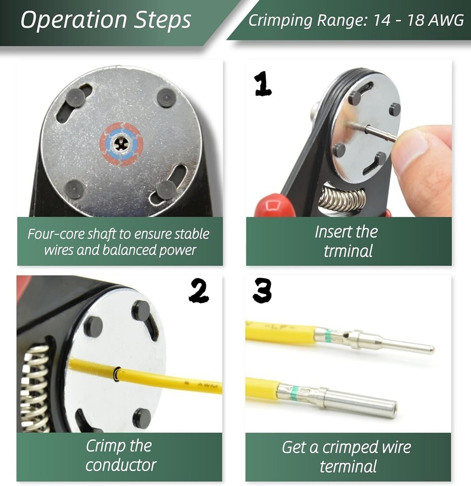 Professional Tools: Professional 4-way indent crimping tool for 12-20AWG Wire, smooth ratchet for accurate and consistent Removal Tool can be used to remove wedgleocks and also release pins and sockets on several Deutsch series connectors. Compatible with DT, DTM, DTP, DRB, DTV, and STRIKE Series