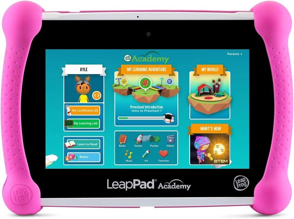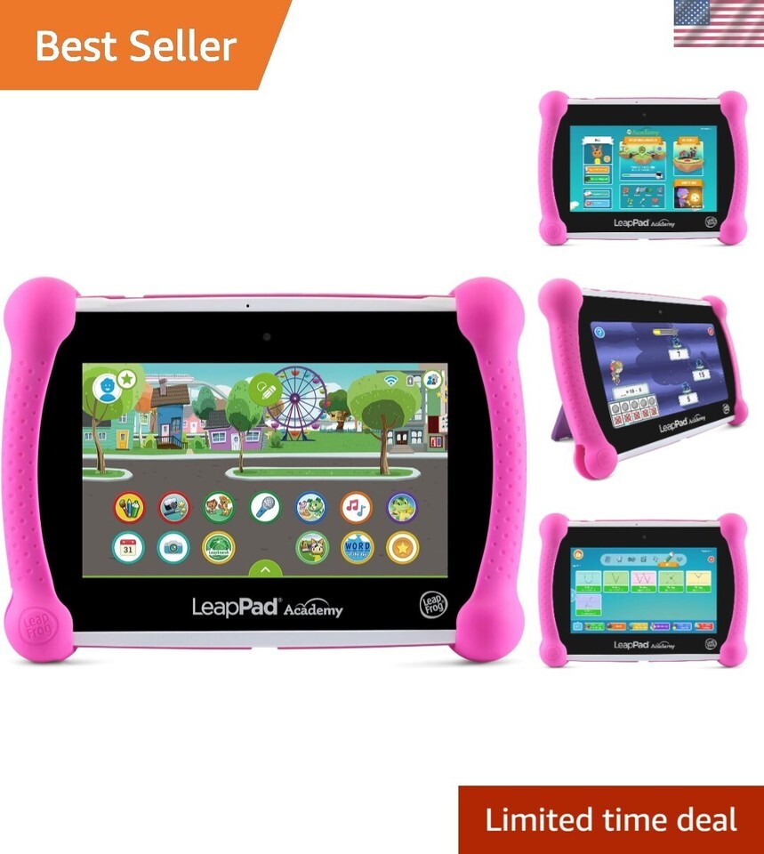 Inspire school success with LeapPad Academy. This learning tablet includes 20 educator-approved apps that build reading, math and science skills, explore creativity and more. Expand vocabulary with a word of the day, draw masterpieces and bring them to life with Art Studio Ultra and explore nature during a field trip to the forest with Ms. Giraffe. Kid-friendly right out of the box, this tablet has a stylus, tough bumper with a built-in kickstand and a 7? shatter-safe screen. Parent controls can be used to set time limits and expand content. As a bonus, LeapPad Academy includes a three- free trial of LeapFrog Academy, an interactive learning program that progressively guides children on Learning Adventures across more than 2,000 games and activities. Download additional content by visiting the LeapFrog App Center to check out hundreds of games, apps, music and videos or download popular Android apps (additional content sold separately). Intended for ages 3-8 s. Rechargeable lithium ion battery included.