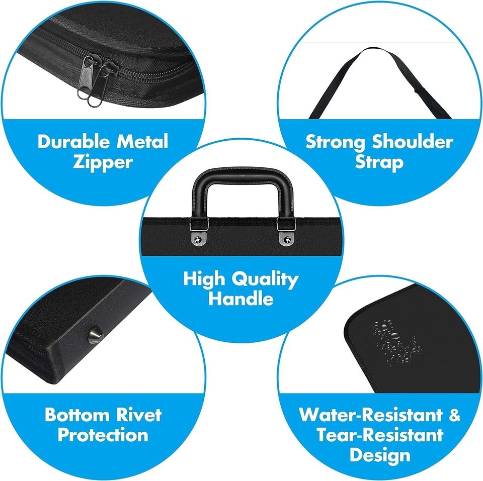 Elegant Design: A convenient case that holds all your drawing supplies going around. Full-length A2 size, durable and waterproof. Combines sturdy Handle and Shoulder strap, Bottom protection button, Internal X strap holder, Side-pocket all together.