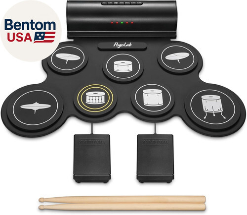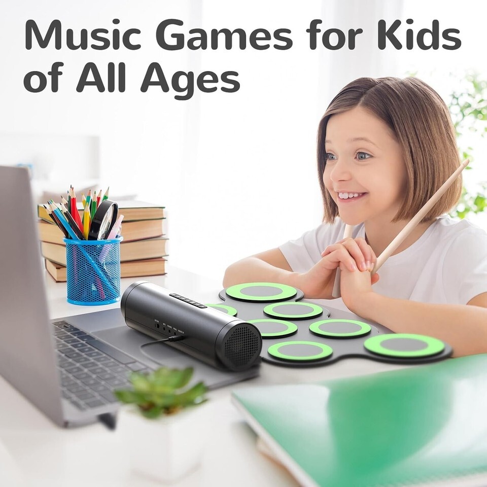 RECHARGEABLE BATTERY: This 7-pad practice drum set is powered by a built-in 2000mAh rechargeable lithium-ion battery, up to 10 hours of playtime per charge. You will be able to take it with you anytime and anywhere even play outside.