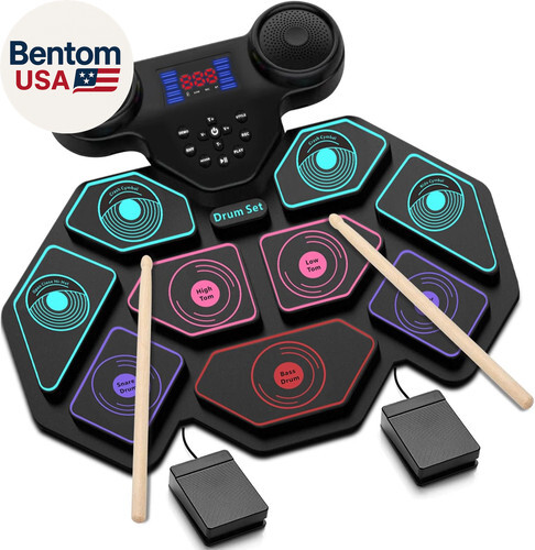 PORTABLE AND PROFESSIONAL DRUM: electronic drum set includes 1 SNARE, 3 TOMS, 1 CRASH, 1 RIDE, 1 HI-HAT and 2 Foot Pedals play the sound of Bass Drum. This roll-up drum kit offers 5 Timbres, 8 DEMO Songs and 3 Rhythms, you can play different music styles. Kids can put this set in their backpacks when they go outdoor.