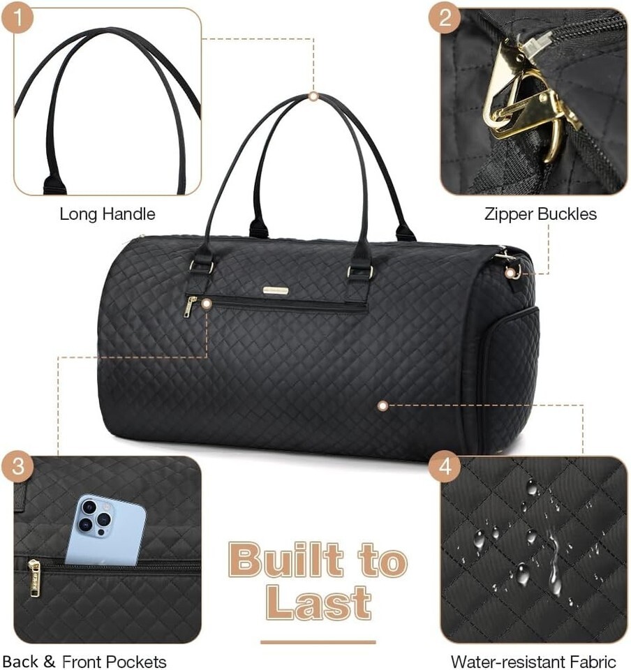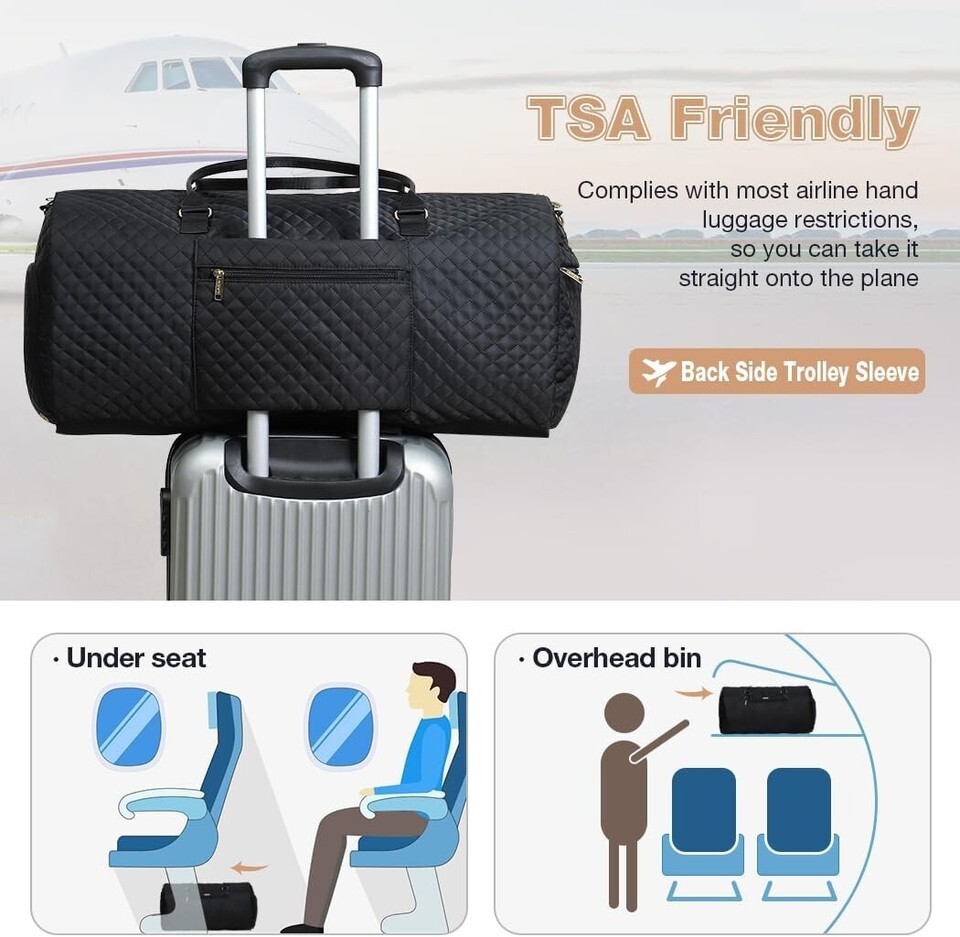 ?2 in 1 Convertible Weekender Bag?With the fancy design of combining the features of garment bags and duffel bag for women, such as hanging clothes (placed with suit, skirt, evening dress), various internal pockets and large capacity (placed with shoes, toiletries, cosmetics and electronic devices, etc.)