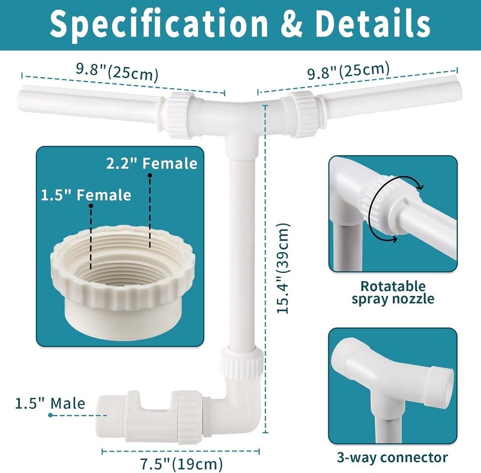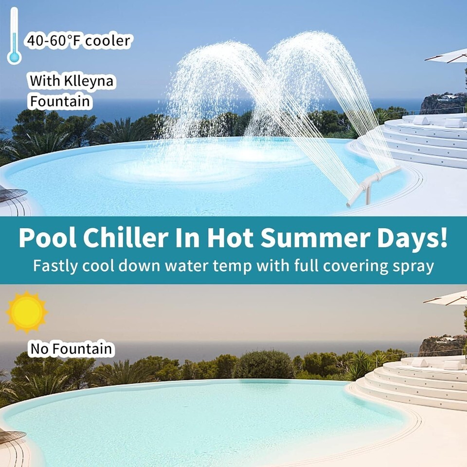 [Innovative Dual Spray Fountain] - Integrated 2 waterfalls spraying from 1 pool outlet, splash double water volume into air, fastly cool down your pool by creating a falling water wide and high, bring a soothing sound to calm down quickly and release pressure from life. Attach directly to pump return outlet, cost no extra power