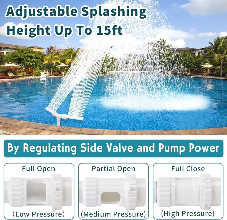 [Controllable Waterfall Direction and Height] - Adjustable PARALLEL and CROSS water spray with a simple rotate on central pipe, adapt to swimming pools of various sizes and shapes. Ensure nozzles toward pool when change direction. Combine with side valve on the bottom, you can adjust water pressure, height and direction to fit your unique pool