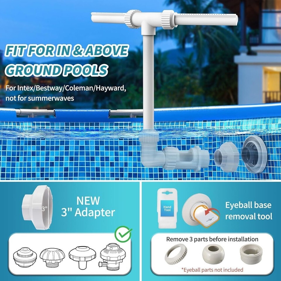 FIT ABOVE INGROUND POOLS - New 3? thread adapter included to fit Intex/Bestway/Coleman and other above ground pools with 1-1/2? and 1 1/4? inlet fittings. The equipped ? fountain thread will fit inground pools such as Hayward and regular pool return jets. Eyeball base removal tool also included to help unscrew the return part and install the fountain connector
