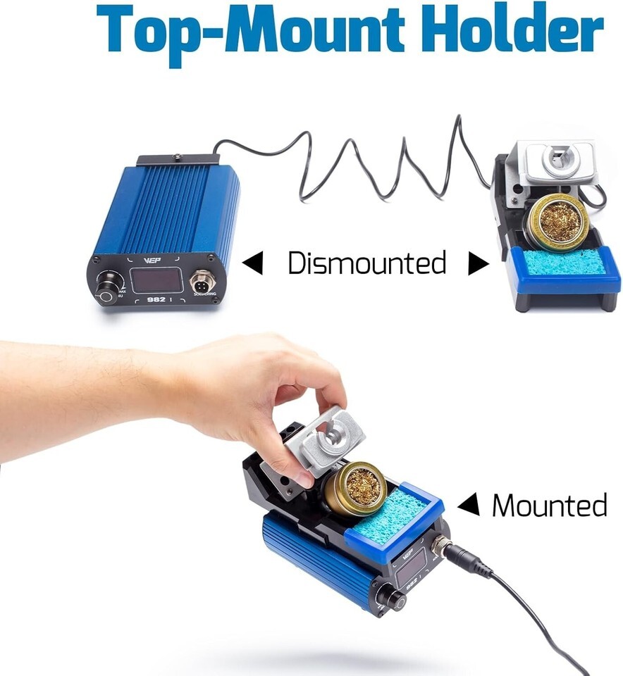 The soldering iron holder can mount securely on top of the solder station via a screw, or be placed separately based on your preference. The solder iron cools to 392F immediately when inside the holder, this reduces unnecessary wear for the heating element and iron plating, effectively extends the service lifespan.