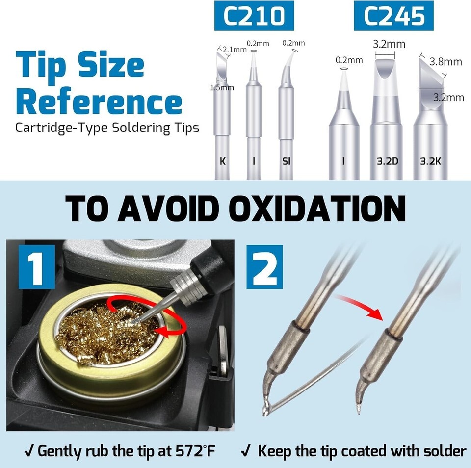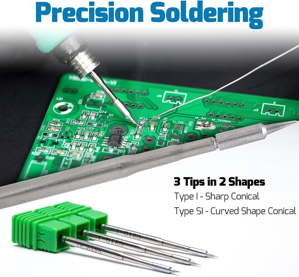 Our soldering station's case is made from rigid aluminum for durability, you don't need to worry about damaging the station when soldering. In this soldering station kit, we include 3 soldering tips (Type-I, SI), the 982-I main unit, a C210-compatible sodering iron handpiece, a soldering iron holder, and power cord.