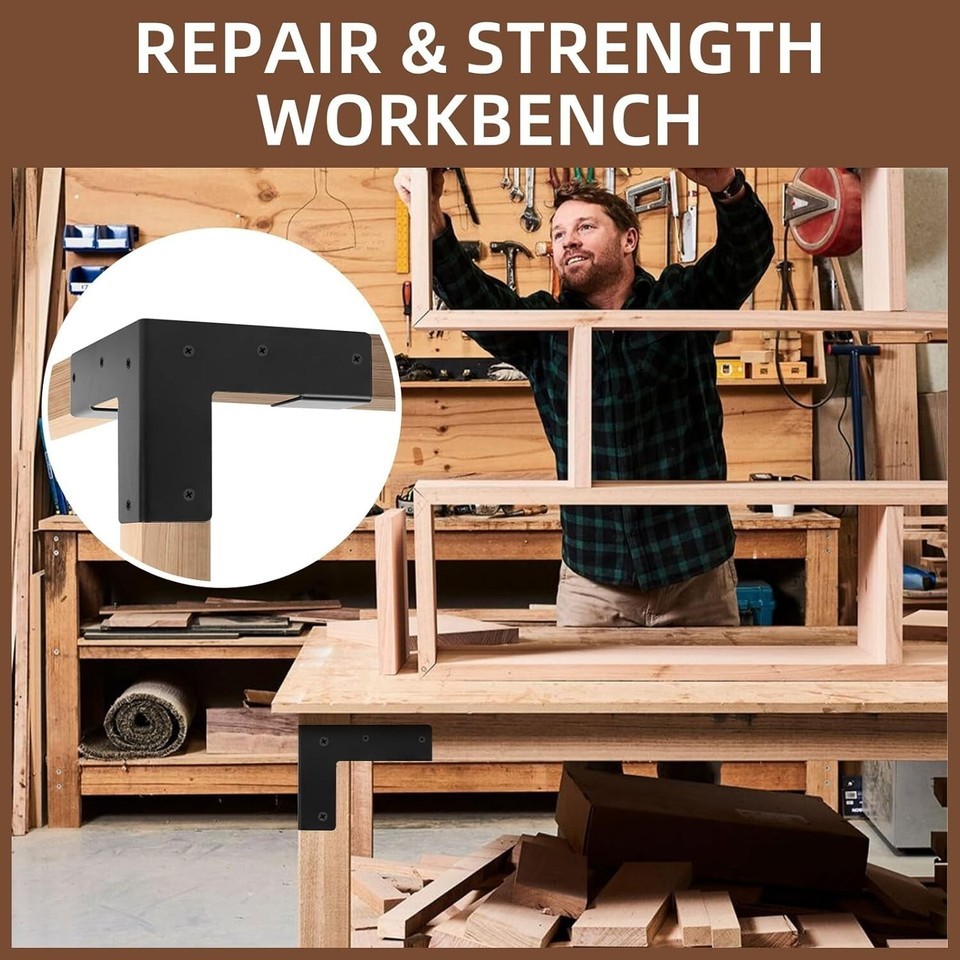 These workbench corner brackets can ensure that the legs and top will be parallel and plumb, make the fixing more stable and solid. You can use these steel corner bracket to build your own table and reinforce your own included) Suitable for wood connections, furniture repairs, shelves, table, beds, installation boards, and wooden greenhouse, etc. Specification: Material: Steel Color: Black Size: x x inches Package Includes: 8 x Workbench Corner Brackets 96 x Screws