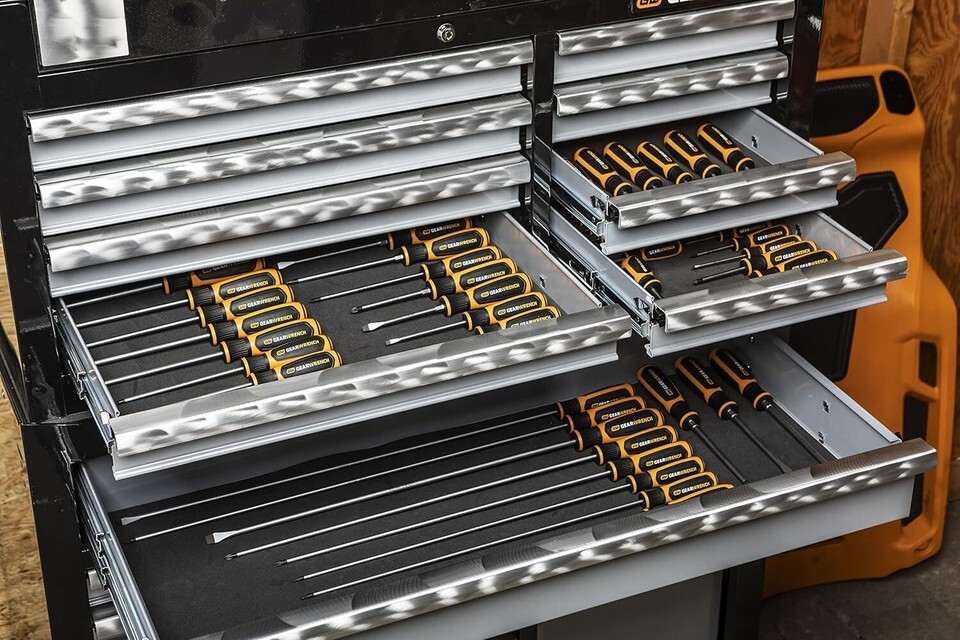 51-piece master screwdriver set includes a large variety of Phillips, Slotted, Torx, Pozidriv, and Square screwdrivers. Ergonomic tri-lobe dual material handle provides the optimal balance of strength and efficiency, while also being oil and solvent resistant. ?Speed zone? design allows for faster rotation in low-torque applications. The alloy steel shaft prevents corrosion, and is laser etched with part number and size for quick identification. Size indicators are shown on the bottom of the screwdrivers as well. Features a non-slip black oxide tip that provides a more secure fit in a fastener.