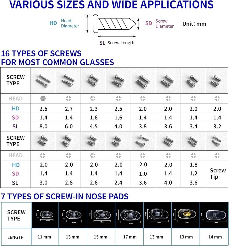 ? Various Nose Pads Screws : Our eyeglass repair kit is also equipped with 11/13/15/17mm different nose pads. You can choose according to your needs. Besides, 16 sizes of tiny screws can also meet your requirement. Since these screws and nuts are made of high-quality stainless steel, resistant to rust and great for eyeglass, you can use the curved tweezer included in this kit to grip these tiny screws. And they are all included in our screw box, which is quite convenient to collect and carry.