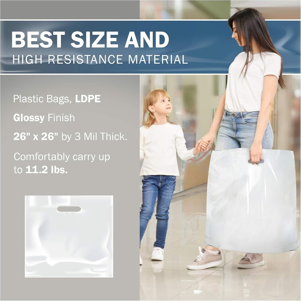 50 Pack Extra Large White Merchandise Bags 26" x 26" x 3 mil Thick - Die Cut Handles - Glossy Plastic Perfect for Retail - Ideal for Shopping, Large Packages, Toys - 100% Recyclable