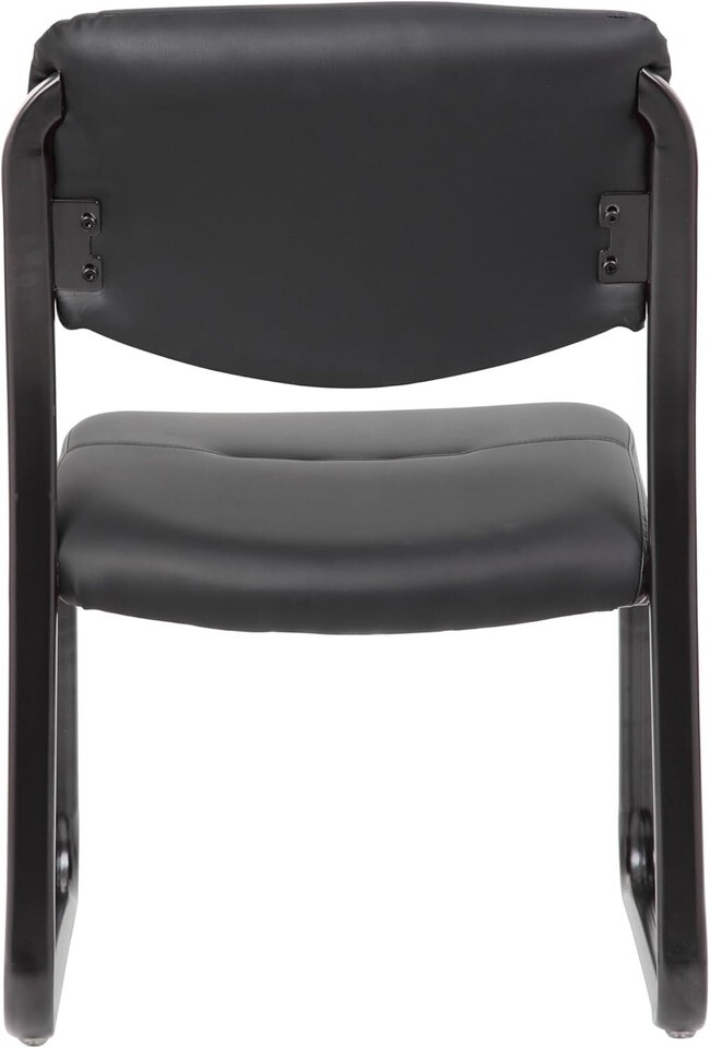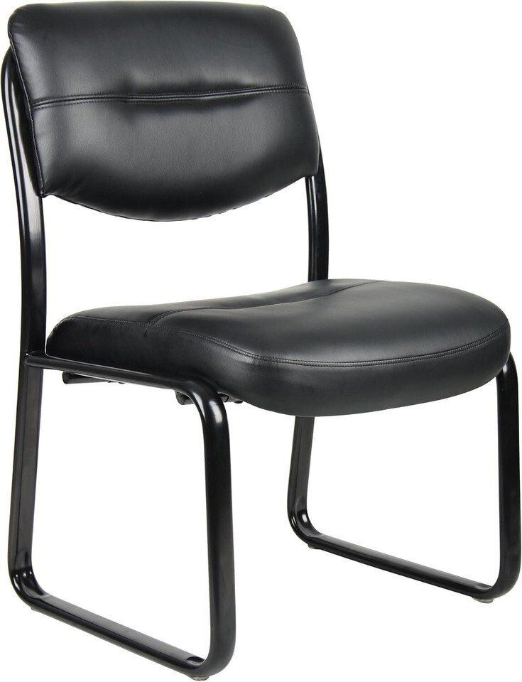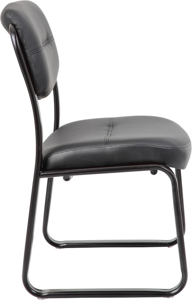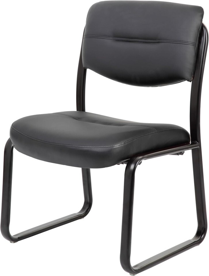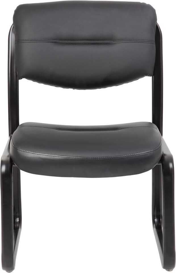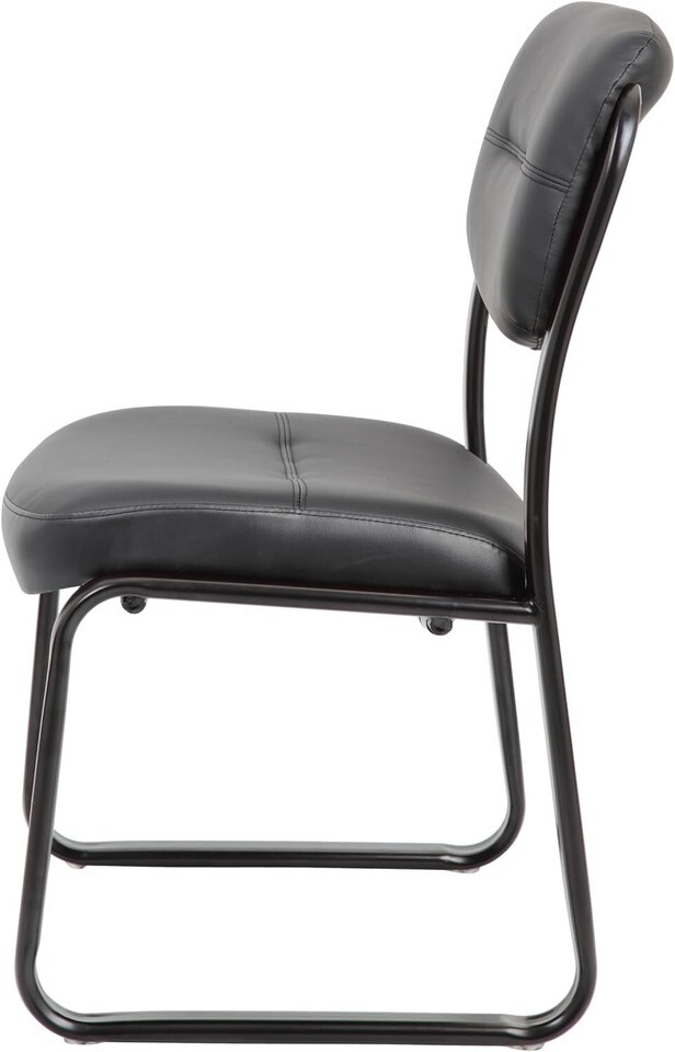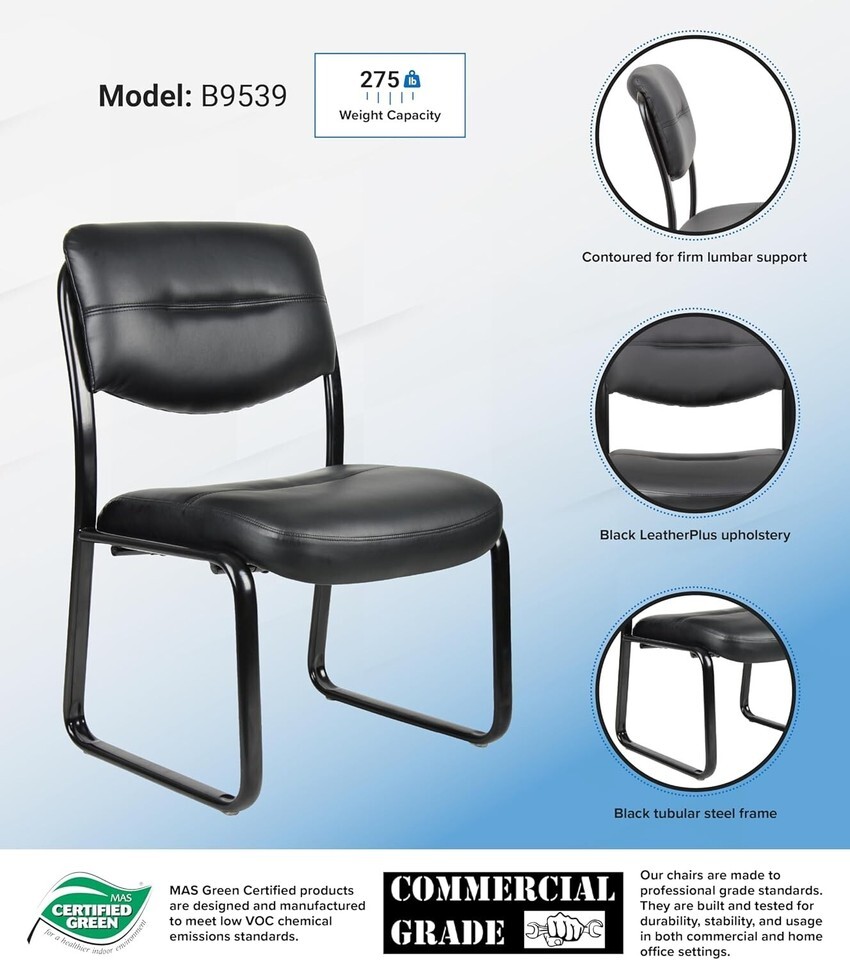 Fully upholstered in Black Leather Plus. Polished tubular steel frame coated with Black scratch resistant finish. Thick contoured cushions for added comfort support. Moves smoothly over hard surface ad plush carpeting. Contoured seat and back provides firm lumbar support.