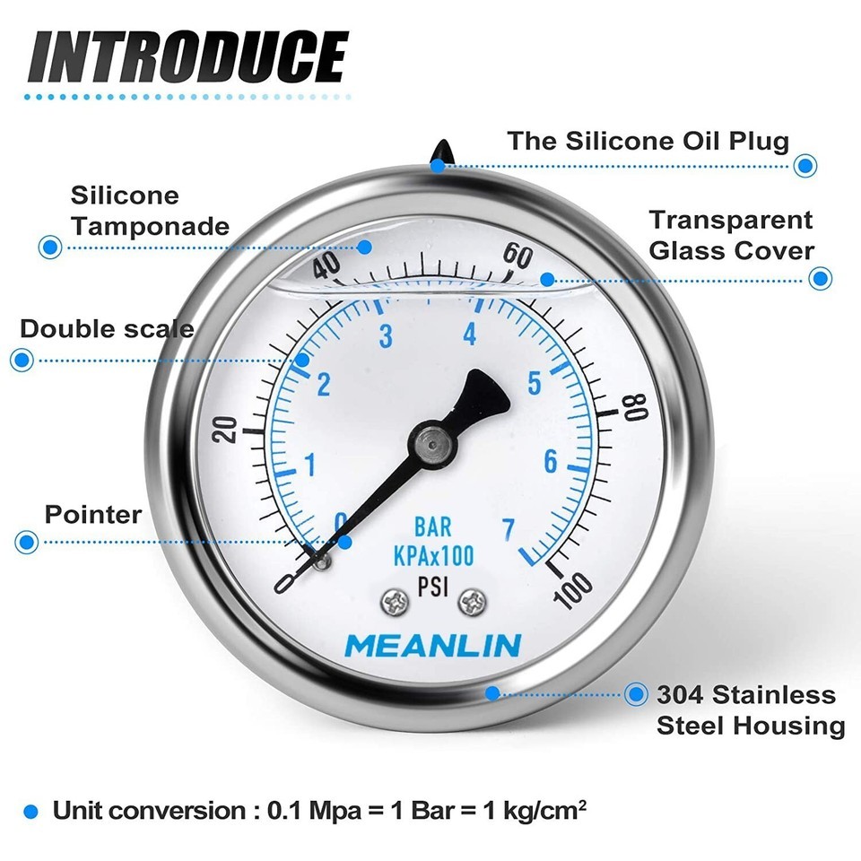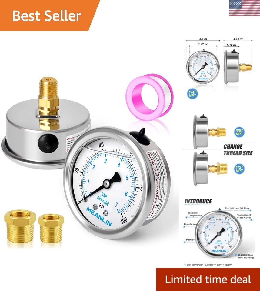 0~100Psi Stainless Steel 1/4" NPT " FACE DIAL Liquid Filled Pressure Gauge WOG Water Oil Air Center Back Mount, with 1/4" x 1/2" NPT and 1/4" x 3/8" NPT Hex Bushing