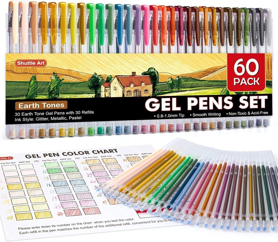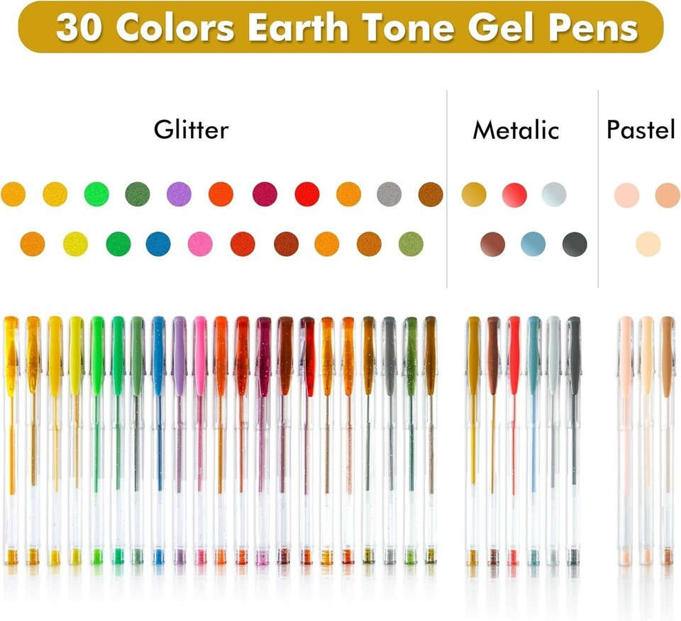 60 PACK EARTH TONE GEL PENS: gel pens set has 30 unique earth tone colors with 30 matched refills, including 3 color types: glitter, metallic, pastel. Specific color tone is suitable for nature, landscapes, animals and so on.
