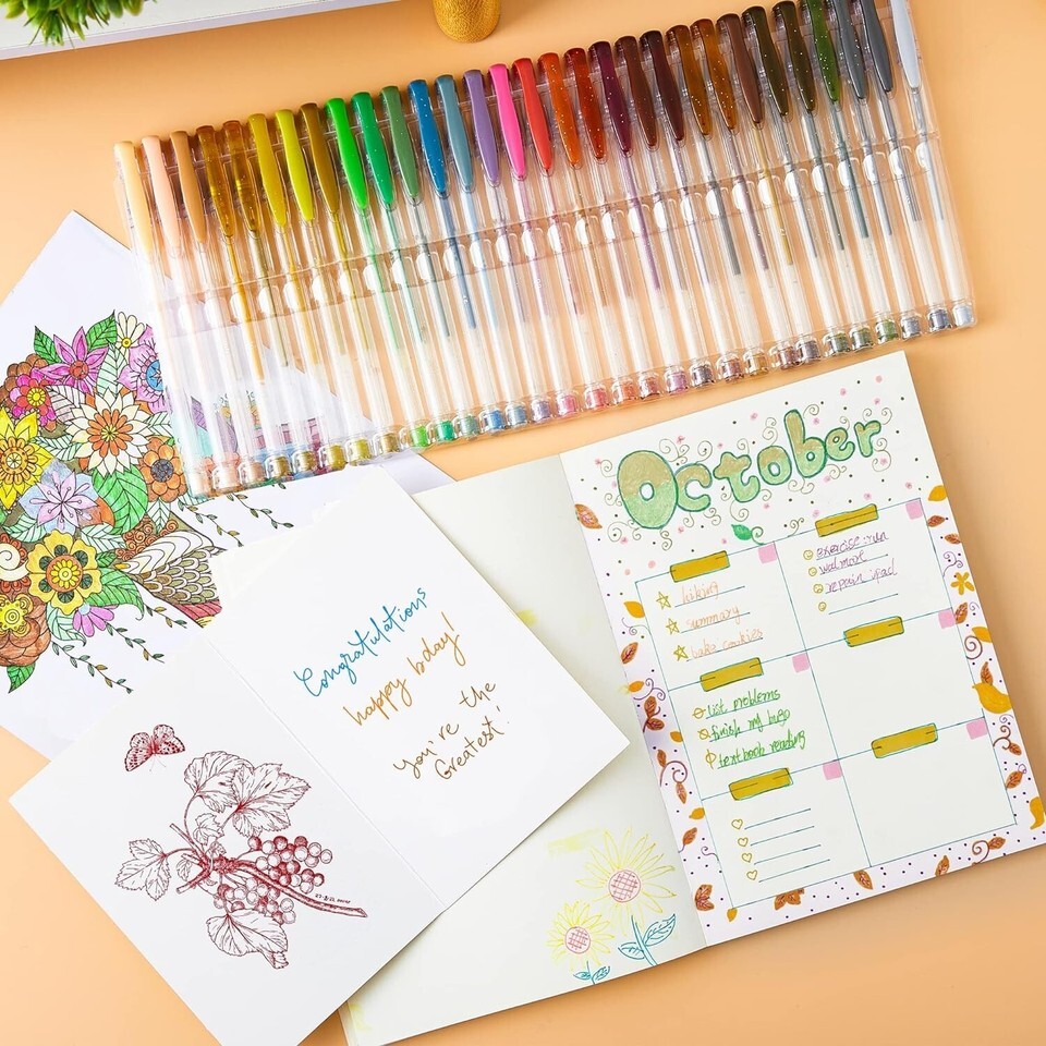 VARIETY OF USES: The coloring gel pen set is non-toxic and acid-free. Conforms to ASTM-D4236. Great for bullet journaling, sketching, drawing, writing, coloring books and any other designs on Scrapbooks, School Projects, Party Invites, Greeting Cards, DIY Decor Letters to Friends Family.