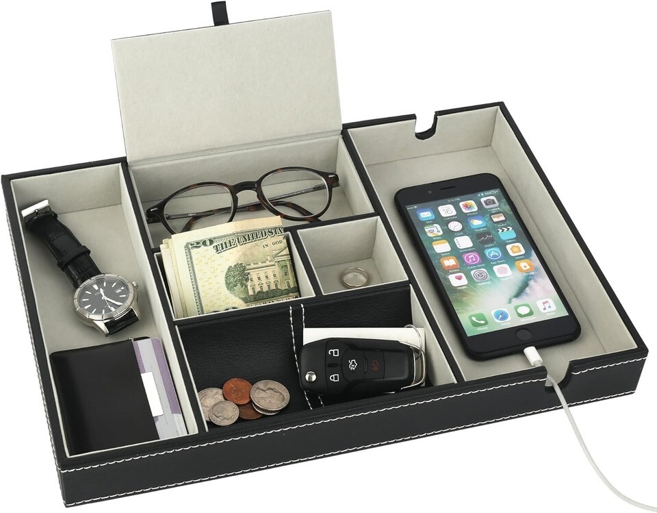 A stylish and functional- This dresser top organizer won't ever fall out of style. It's a useful gift for all the men in your life. The tray comes in a presentable and ready-to-wrap packaging.