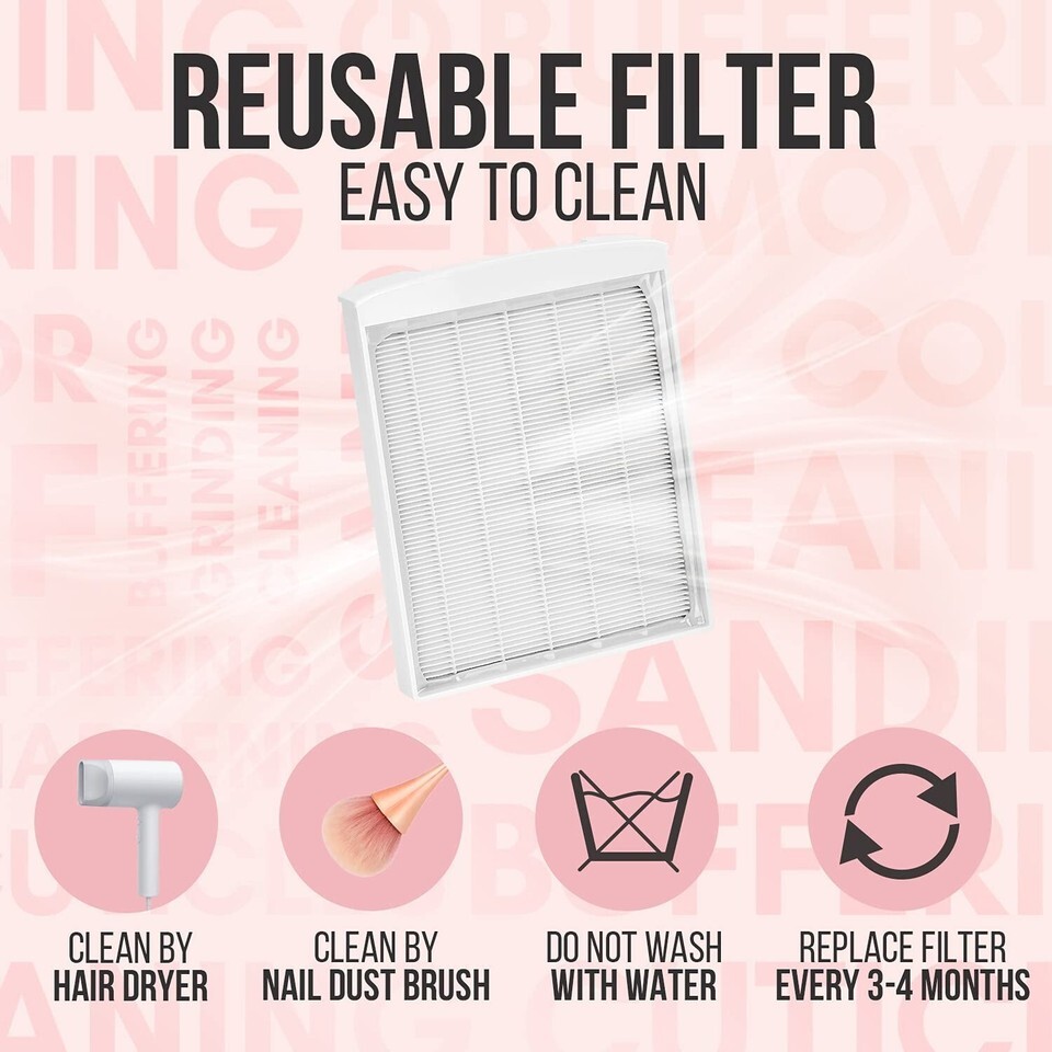 Reusable Nail Dust Filter: With a replaceable and reusable filter, you can easily taken out to clean with a hairdryer or dust brush, no need to change it every time. We highly recommend you replace the filter every 2-3 s for better suction results.