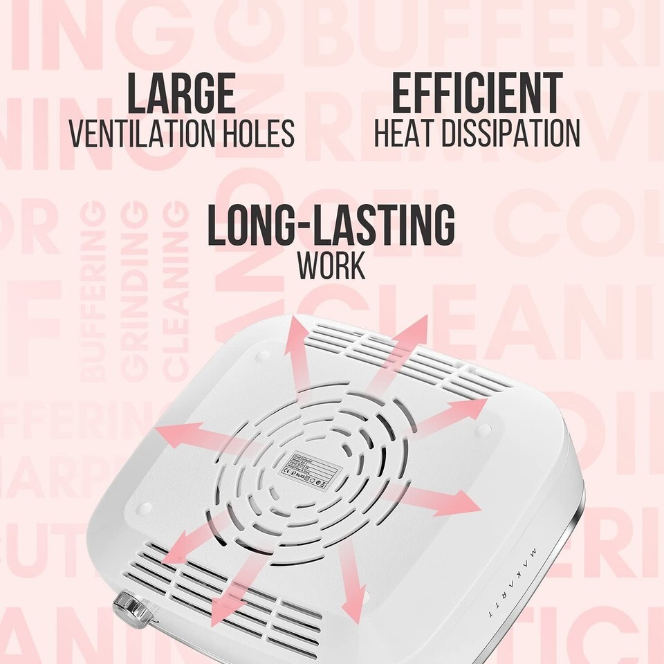 Efficient Heat Dissipation: The large ventilation holes on the back and 2 sides helps heat dissipation efficiently which ensures that the nail dust suction machine will not generate heat for the long-time working.