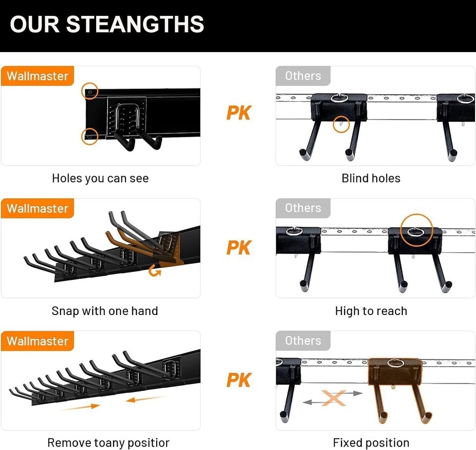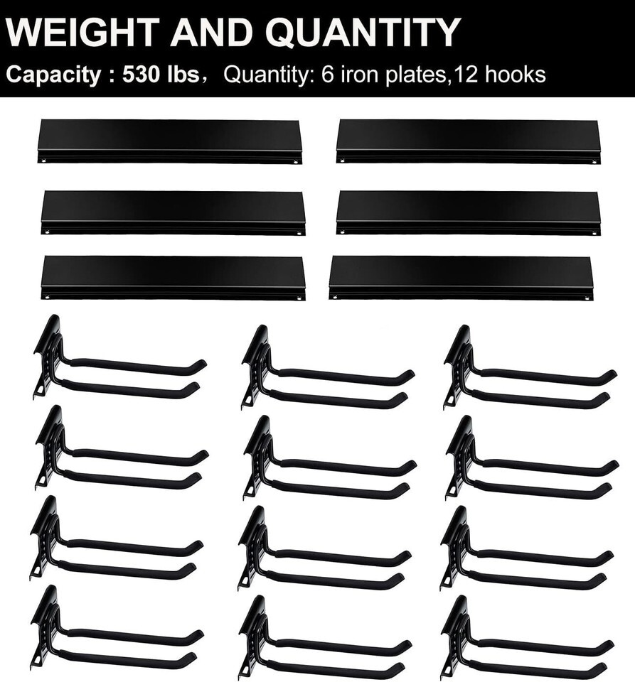ADJUSTABLE STORAGE SOLUTION ? The best part of the garage storage system is that the hooks can snap on the rail and move around on it to meet your actual needs.
