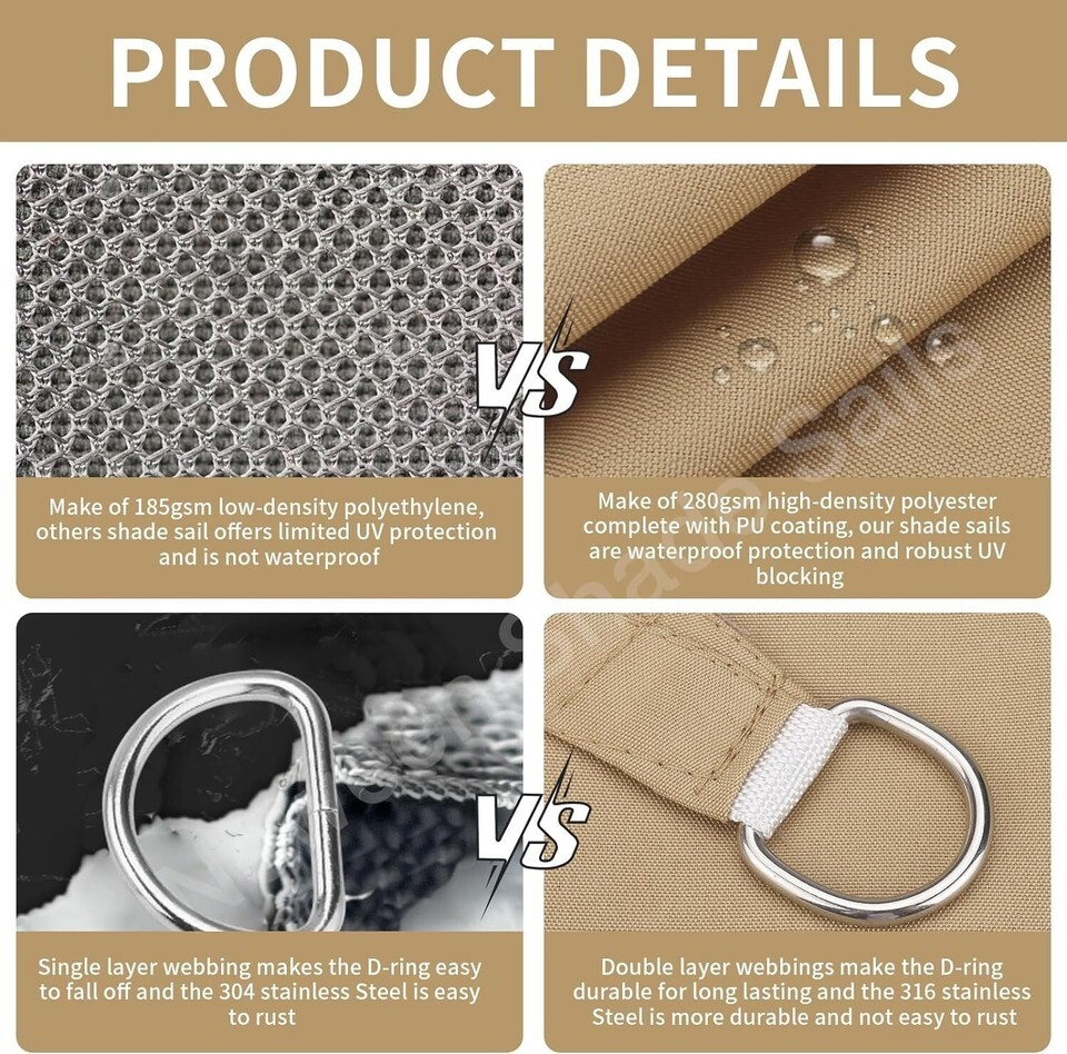 ?Structure Designed for Durability?: All edges are constructed with heavy duty double layered reinforced stitched seams, prevents frayed edges and out of shape. Each corner ends with stainless Steel D-ring for easy hanging, extra heavy stitching to help the d-rings strongly attached to the shade sail. Easy to setup, and fairly durable.