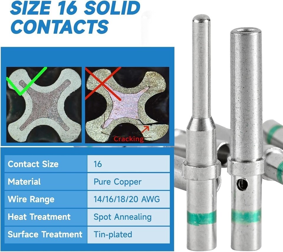 ??Pb-free Size 16 Solid Contacts?111 Pairs Pins Sockets. These contact are tin bronze with nickle plated, accept 20/18/16/14AWG gauge wire. Green band above, which has strong stability and conductivity. Easy to crimp with wire and install, providing reliable connections for variety applications.
